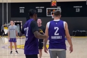 视频当中,东契奇和范德比尔特互换球衣,两人各自身穿对方的球衣进行训练。