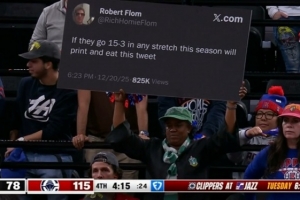 而在此前,一位网友曾表示,如果快船本赛季能够在任意阶段取得15胜3负,他将打印这条推文并吃掉。
