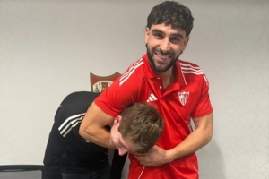 随后,他又发了一张照片,照片里他用胳膊夹住了塞维利亚媒体团队的一名成员的脖子。他为这张照片配文:“女士们先生们,我们抓到他了。”