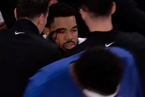 GIF-唐斯突破对抗斯潘塞·琼斯,二人都流血,唐斯眉骨被打破,贴创可贴罚球后回更衣室处理