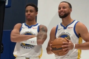 库里发现队友麦克米利安站在摄影师旁边,就指着问到:“他在那干啥?”旁边有人回应库里:“他想和你合影。”库里说:“那他不知道问一下吗?”库里的保镖说道:“没有。”