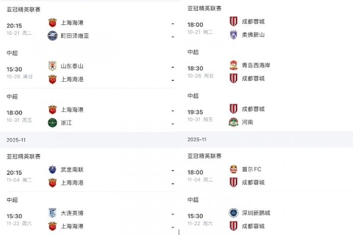 体育资讯10月17日讯 中超还剩最后3轮,海港、蓉城、申花剩余赛程如下。