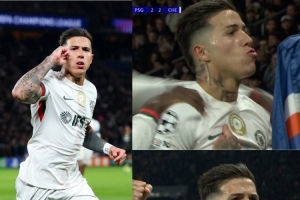 恩佐·费尔南德斯此役为切尔西贡献传射,他在进球后手指球衣上的世俱杯金标,在去年的世俱杯决赛中,切尔西战胜巴黎夺得冠军。