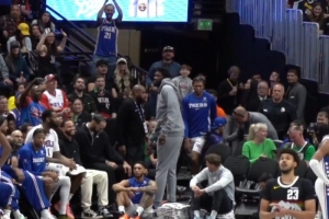 体育资讯3月18日讯 76人客场挑战掘金,据记者Tony Jones报道,恩比德下半场出现在场边,被丹佛主场球迷狂嘘。
