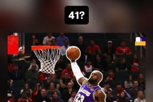 赛后,拉拉维亚转发了詹姆斯的一张腾空海报,并写道:“41岁?”