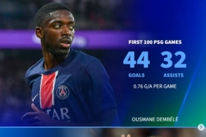 登贝莱:44球32助,场均参与0.76球