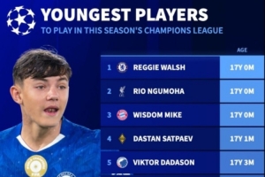 以下为欧冠各队有望出战比赛最年轻球员排行: