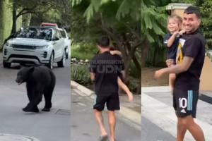 视频中一头熊慢慢腾腾的在公路上走着,科雷亚抱着2岁的女儿莉亚连连后退。