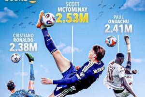 麦克托米奈倒钩时的脚尖高度为2.53米,此前奥努阿楚的纪录为2.41米,而C罗的纪录为2.38米。