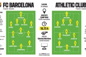 体育资讯11月22日讯 北京时间11月22日23:15,2025-26赛季西甲联赛第13轮,巴塞罗那将坐镇主场迎战毕尔巴鄂竞技。赛前,《每日体育报》撰文分析了弗里克目前的选择,预测了本场比赛球队可能的首发阵容。