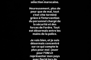 “幸运的是,惊吓大于伤害,事件在安保人员和执法部门的及时介入下迅速平息。目前一切已交由警方处理。我现在很好,也已将注意力重新放在最重要的事情上:为马赛效力,并在即将到来的国家队集训中自豪地代表祖国出战。”
