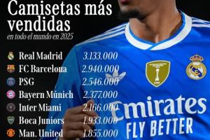 2025俱乐部球衣销量榜:皇马313万居首,巴萨、巴黎前三,曼联第7