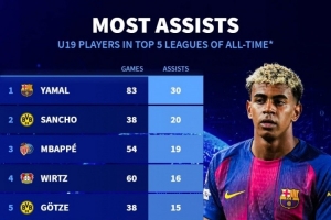 五大联赛历史U19球员助攻排名(19岁之前助攻):