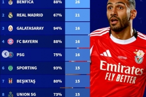 2025年俱乐部获得点球排行:本菲卡26个居首,皇马21个,巴萨14个